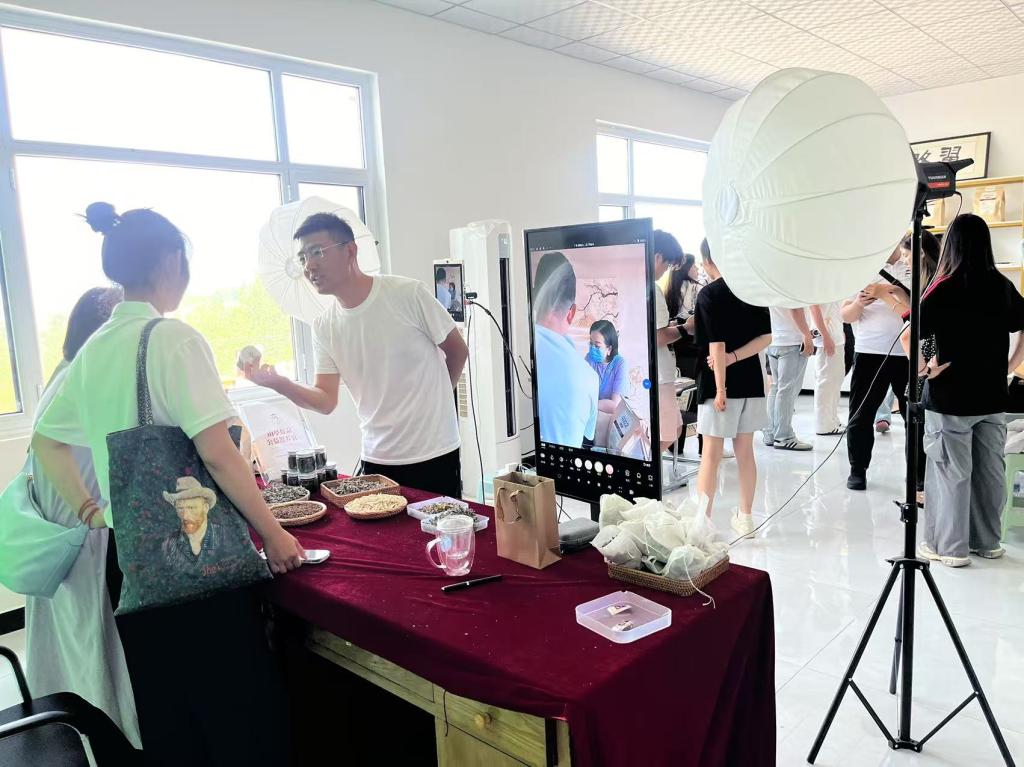 活动中,实践队首先实地参观了青年电商创业孵化基地,现场观摩了直播流程,并与返乡创业青年深入交流,了解他们如何通过跨境电商平台将甘薯制品、翼云酸枣等特色农产品成功推向国际市场。随后,到皓志食品公司现场参观了“零添加”的高标准生产线,深入了解了产品制作工艺与企业运营模式,进一步提升了对电商直播产业的认知和应用能力。