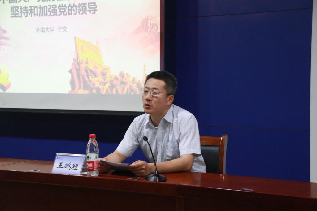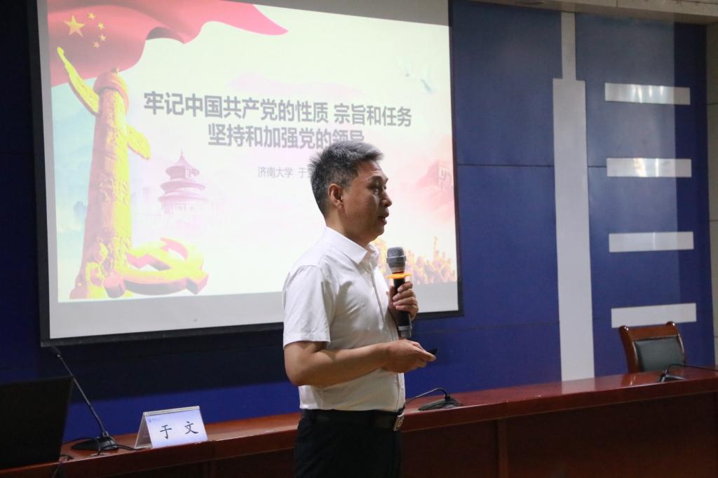 于文以《牢记中国共产党的性质、宗旨和任务,坚持和加强党的领导》为题,围绕“中国共产党的性质和宗旨”“党的最终目标和现阶段的任务”和“坚持和加强党的领导”三个方面进行讲授。他从中华民族历史讲起,通过对中国近代史的发展历程中重要节点的阐述,警醒学生们不忘百年屈辱史,引出“坚强领导核心与政治组织力”对于中华民族屹立不倒的重要性,强调中国共产党的重大历史作用。此外,他还对改革开放以来取得的成就系统阐述,印证了只有中国共产党才能让中国人民站起来,富起来,强起来,并借此来表现中国制度与体制的优越性。于文号召大家要深刻理解和把握“两个确立”的决定性意义,树牢“四个意识”,坚定“四个自信”,做到“两个维护”,始终坚持爱国信党,维护国家和民族的利益,团结起来,振兴中华。